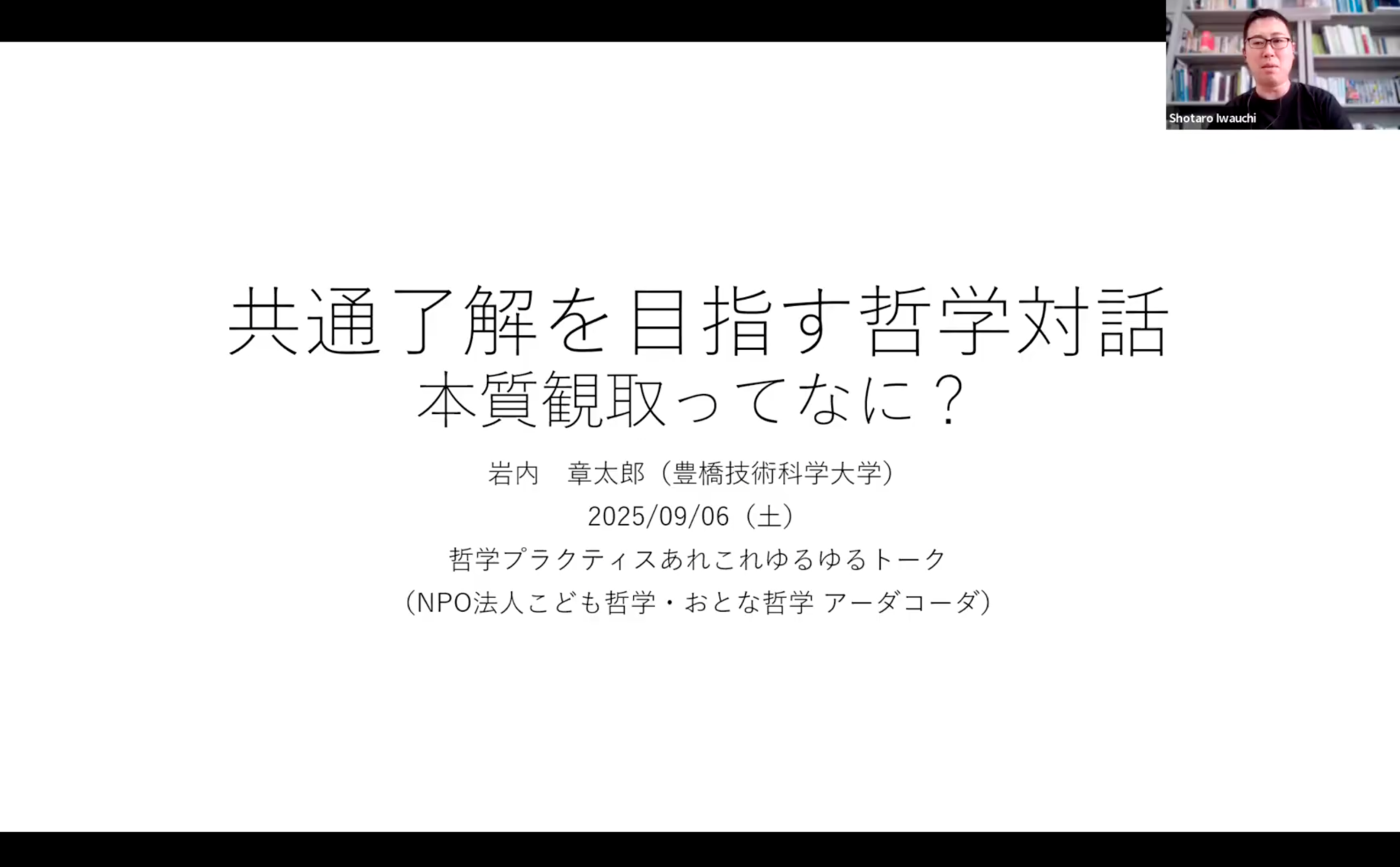 当日は、岩内さんの自己紹介からスタート。哲学対話、本質観取に取り組むようになった経緯や、これまでの活動についての話から、「本質観取」とは何か、というテーマに入っていきました。「本質観取」とは「共通了解を目指す」哲学対話である、という岩内さん。