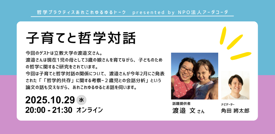 [ 主催 ] NPO法人こども哲学・おとな哲学アーダコーダ[ 日時 ] 10月29日(水) 20:00~21:30 (アーカイブ配信あり)