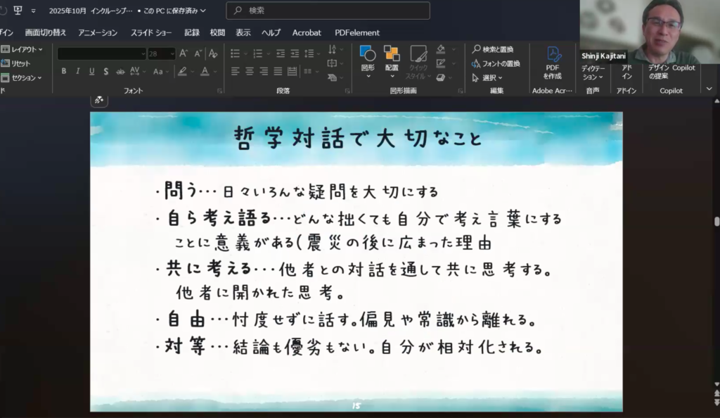 「哲学対話で一番大事なことって、一緒に考えると仲良くなるっていうこと。ある意味すごく不思議なことが起きると思うんですね。それでいつの間にかお互い尊重するような関係が作れているっていうのが、僕は哲学対話の魅力だなと思います」という言葉に、大きく頷いた方も多かったのではないでしょうか。