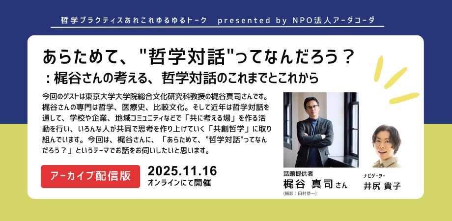 2025年11月の哲学プラクティスあれこれゆるゆるトークのテーマは「あらためて、”哲学対話”ってなんだろう?:梶谷さんの考える、哲学対話のこれまでとこれから」。ゲストには、東京大学大学院総合文化研究科教授の梶谷真司さんをお迎えしました。