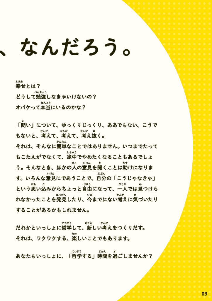 哲学対話とは「答えがない問いについてみんなで深く考えることができる場」です。 例えば・・・・友達って […] -