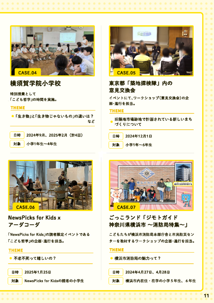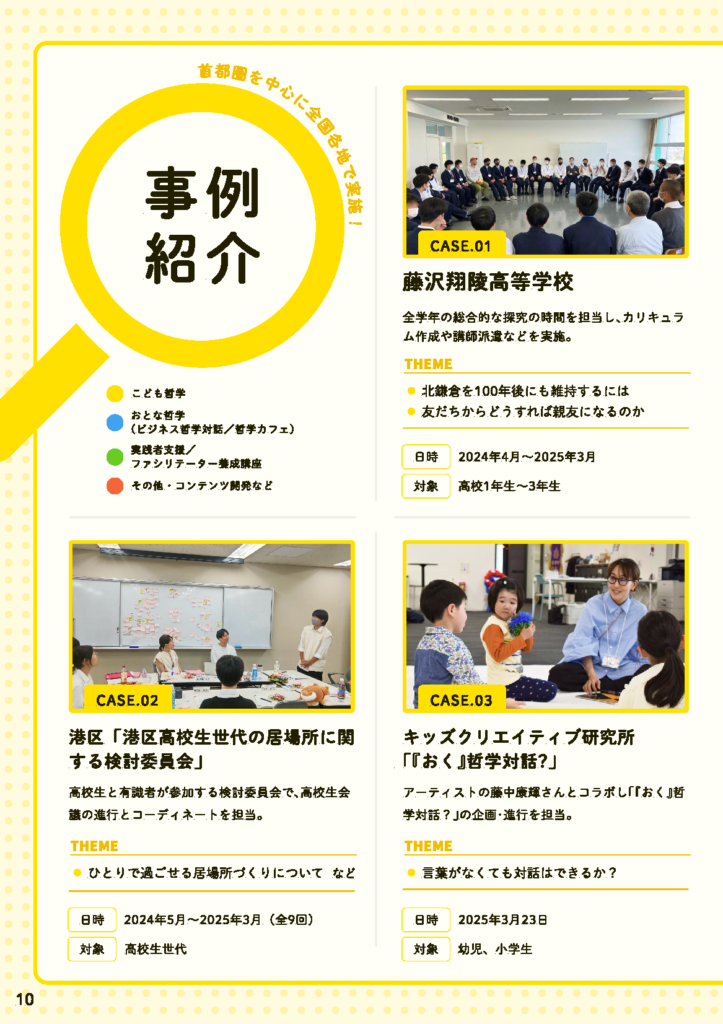 上記のほか、主催イベントや、公共施設やメディアでの哲学対話に関する企画等への協力を通じて、哲学対話の普及を目的とする様々な活動に取り組んでいます。