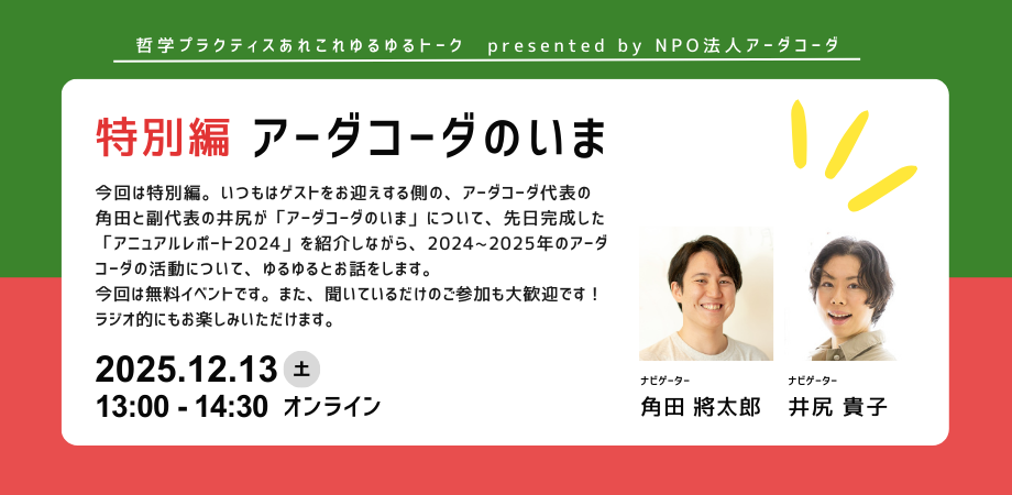 [ 主催 ] NPO法人こども哲学・おとな哲学アーダコーダ[ 日時 ] 12月13日(土) 13:00~14:30 (アーカイブ配信あり)